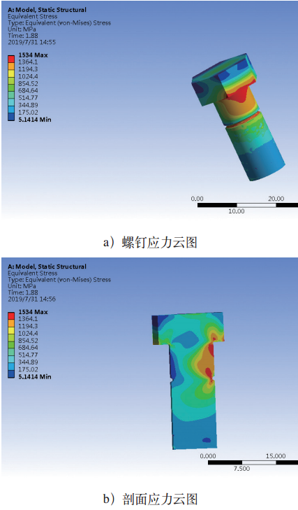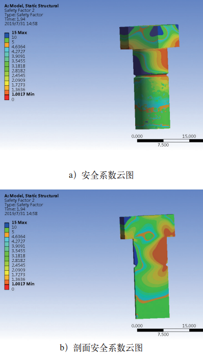 從安全系數云圖(見圖4)中可以得出,螺釘大部分結構安全系數高于3,第一扣螺紋附件安全系數在1~1.7,螺釘連接可靠,結構設計合理。水壓失效螺釘實際斷裂模型與仿真結果導向一致,起始斷裂位置在螺釘第一扣螺紋處。