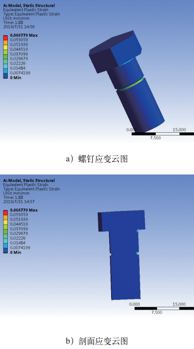 對法蘭連接結構進行仿真驗證,建立模型對法蘭連接結構進行分析和計算,計算出螺釘在16MPa內壓載荷下螺釘受力情況。由應力云圖(見圖2)可以看出,螺釘最大等效應力為1534MPa,出現位置為第一扣螺紋底部,在塑性應變云圖(見圖3)中,最大塑性應變為6.6%,綜合以上兩個結果,螺釘在承力時,第一扣應力最大,但是應力主要集中在螺釘表面,螺釘心部應力較小,為發生塑性應變。