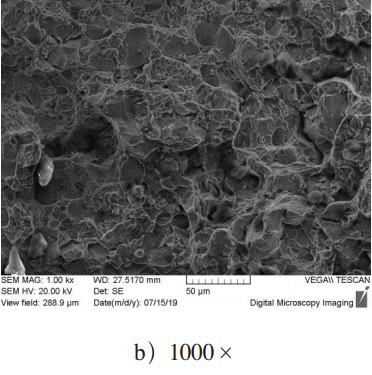 采用掃描電鏡對斷口進行微觀觀察,如圖6所示。通過對螺釘斷口微觀觀察,能夠看出,螺釘斷面出現大量高密度短而彎曲的撕裂棱線,高倍照片中能夠看到大量的小平面及二次裂紋,可以判斷斷口為準解理斷口[2]。掃描斷口未發現明顯“雞爪痕”,且螺釘加工過程無涉氫環節,氫脆可能性較小。