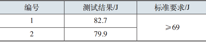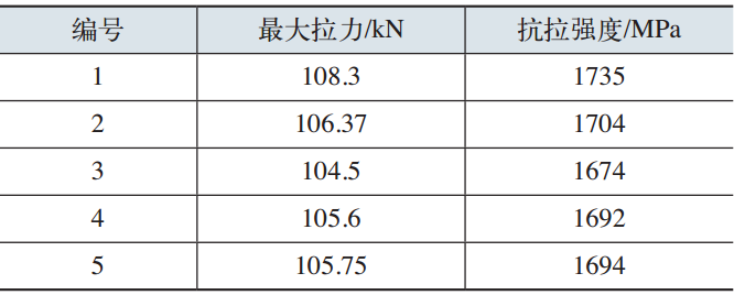 對加工完成的螺釘及同爐拉伸試樣進行了單軸拉伸和沖擊試驗,單軸拉伸試驗測量了螺釘最大軸向拉力及材料抗拉強度和伸長率,沖擊試驗測量了材料韌性性能。最終試驗測試結果表明,螺釘抗拉強度及伸長率滿足標準要求,沖擊吸收能量低于標準要求,材料性能按照標準QJ 2142—1991《超高強度鋼的熱處理》執行,測試結果見表1~表3。