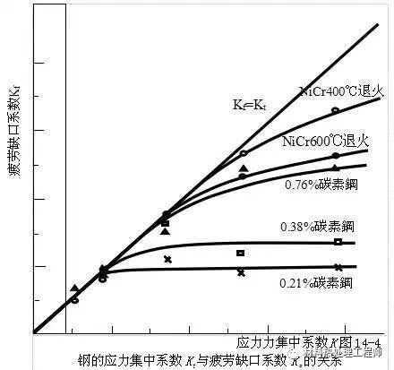 圖14-4為鋼的應(yīng)力集中系數(shù)Kt與疲勞缺口系數(shù)Kf之間的關(guān)系。由圖可見,對于低中碳鋼,在應(yīng)力集中系數(shù)小于2~2.5時Kt與Kf基本相同,但當(dāng)超過此數(shù)值時,Kf的增長速度明顯變慢。而對于高碳鋼等強度比較高的鋼,Kf隨Kt線性遞增的關(guān)系保持很長的范圍。由此可知,高強度鋼的疲勞強度對缺口的敏感性高而低中強度鋼的疲勞強度對缺口的敏感性較低。