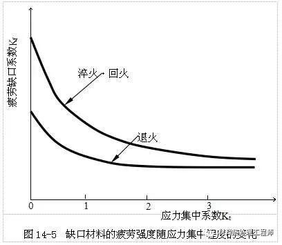對于光滑材料,通過表面淬火、表面滲碳、表面氮化等表面熱處理可以有效地提高其疲勞強度。但是對于缺口材料,這些方法可能變的沒有效果甚至使疲勞強度反而降低。這是因為通過熱處理使其表面強度提高的同時,使缺口敏感性也變高的緣故。圖14-5為高強度鋼和塑性較好的低強度鋼的缺口材料的疲勞強度隨應(yīng)力集中程度的增加而變化的情況。在應(yīng)力集中Kt較小的范圍內(nèi),高強度鋼的疲勞強度明顯比低強度鋼的高。但隨著應(yīng)力集中系數(shù)的增加,高強度鋼的疲勞強度的降低速度明顯大于低強度鋼者,以致于高強度鋼的疲勞強度與低強度鋼的疲勞強度相差無幾。