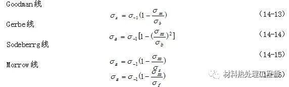 幅σa和對稱循環(huán)疲勞極限σ-1的比值,兩者都是無量綱的量。從圖中可以看出,多數(shù)試驗數(shù)據(jù)點落在直線與曲線之間。這條直線稱為古德曼(Goodman)線,見式(14-13);曲線就是杰柏(Gerber)拋物線,見式(14-14);用屈服極限σs代替σb得到索德柏格(Soderberg)線,見式(14-15);用斷裂真應(yīng)力σf代替σb,得到摩儒(Morrow)線,見式(14-16)。
