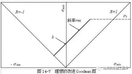 古德曼(Goodman)線對于延性金屬略偏保守且簡單方便,在疲勞設(shè)計中應(yīng)用最廣。常用的還有另一種叫做理想的改進Goodman圖。圖14-7為工字形型鋼對接梁彎曲疲勞載荷下理想的改進Goodman圖。橫坐標(biāo)表示最小應(yīng)力σmin,縱坐標(biāo)表示最大應(yīng)力σmax,其直線方程式為