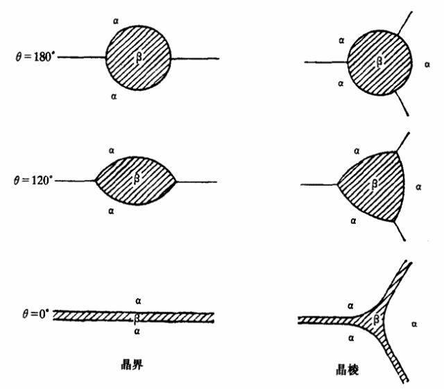 2.晶界第二相第二相(β)存在于基體(α)的晶界時,第二相在兩基體晶粒間張開的角θ稱二面角。平衡條件下,有如下關(guān)系: