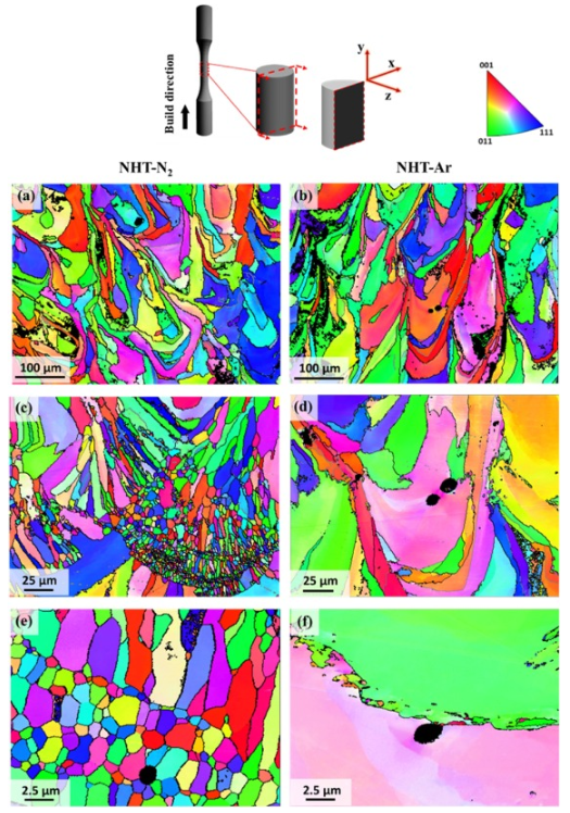 圖2。軸向疲勞試樣的示意圖以及平行于構建方向的橫截面以進行微觀結構表征,NHT LB-PBF 17-4 PH SS試樣的EBSD結果:(a),(c),( e)IPF NHT-N2和(b),(d),(f)IPF NHT-Ar。