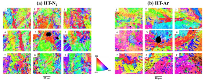 圖3 熱處理的LB-PBF 17-4 PH SS樣品在平行于構建方向的橫截面上的IPF圖:(a)HT-N 2和(b)HT-Ar