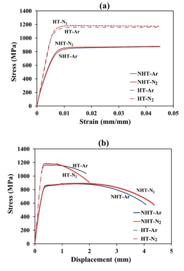 圖6 在NHT和HT條件下在Ar和N 2保護氣下制造的LB-PBF 17-4 PH SS樣品的單調拉伸行為:(a)應變控制到0.045應變,和(b)除去引伸計后進行位移控制直至斷裂