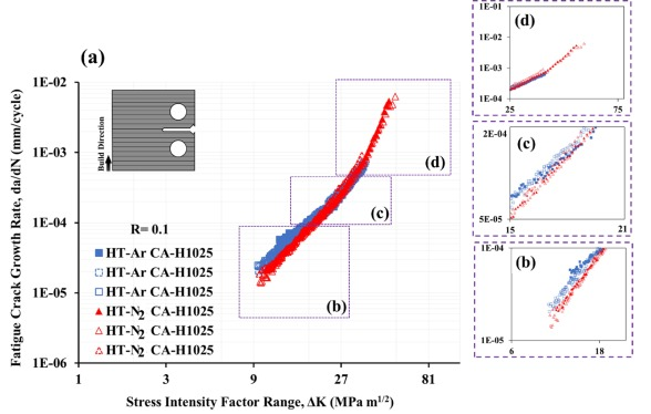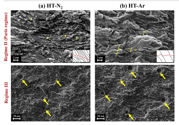 圖7 在熱處理條件下在N2和Ar保護氣下制造的LB-PBF 17-4 PH SS試樣的疲勞裂紋擴展(FCG)速率(CA-H1025)。在(b),(c)和(d)中分別放大并顯示了三種不同的FCG機制