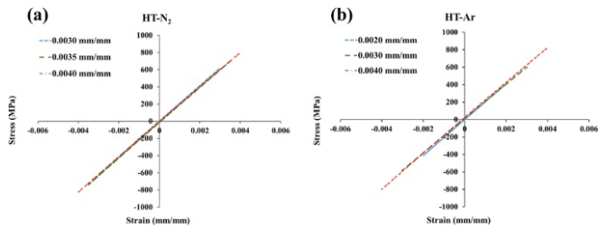 圖8。LB-PBF 17-4 PH SS樣品的完全反向,應變控制的恒定振幅疲勞測試的穩定磁滯回線:(a)HT-N2和(b)HT-Ar