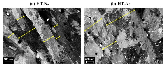 圖10。LB-PBF 17-4 PH SS的電子通道對比度圖像(ECCI)顯示了(a)HT-N 2和(b)HT-Ar標本中的板條馬氏體。注意,黃色虛線箭頭代表板條馬氏體的厚度。白色顆粒是拋光化合物的殘留物,不是17-4 PH SS中的任何第二相。