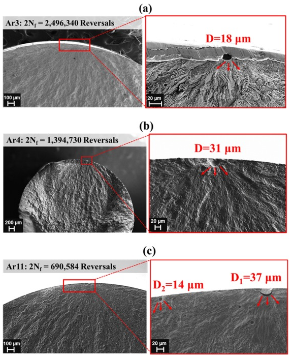 圖11。HT-Ar試樣在0.0025 mm / mm應變振幅下的斷裂面:(a)試樣“ Ar3”具有2,496,340的破壞;(b)試樣“ Ar4”具有1,394,730的破壞,以及(c)試樣“ Ar11” 690,584破壞