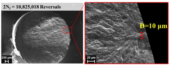圖12。氮氣保護氣體下制備的LB-PBF 17-4 PH SS試樣的斷口表面試件“N2”在0.0025 mm/mm應變幅值下發生10,825,018次逆轉破壞