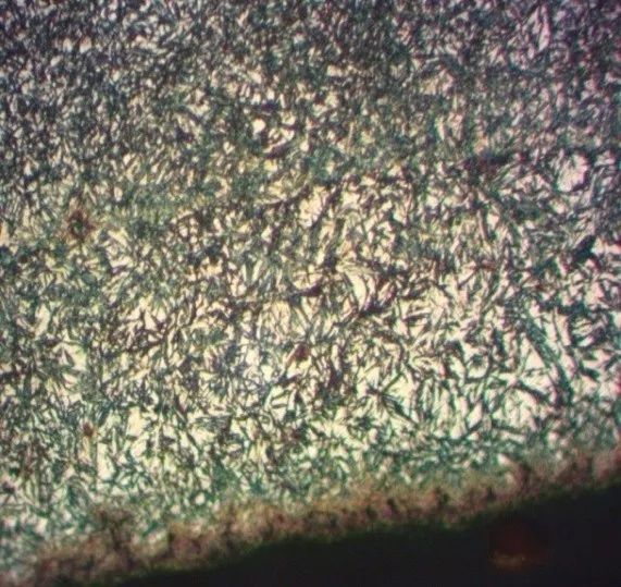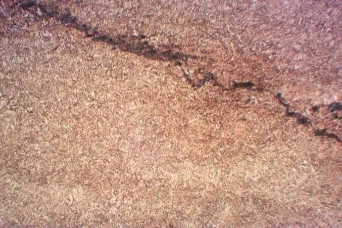 由以上金相圖片可以看出,該零件回火穩定性非常高,需要2~3次回火才能將殘留奧氏體量控制到較低的水平。熱處理工藝從滲碳后直接淬火改為“滲碳后緩冷,然后再加熱淬火”,并200℃保溫4H三次回火后,金相組織較好,工藝改進取得較好效果,但意外的是試制的第一爐產品(二次回火)在磨削后放置3天后又發現1件裂紋,裂紋部位、形狀與前面發現的相同,經對裂紋件取樣分析,金相組織為C3,A+M4級,為此我們再次對工藝進行了改進。