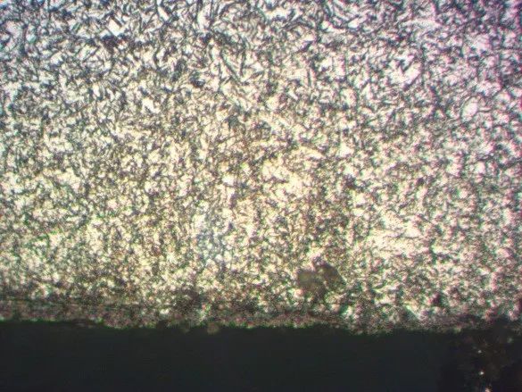 經對裂紋件取樣進行金相分析,裂紋兩側無氧化脫碳,硬化層深HV550:1.20mm,碳化物2級,馬氏體及殘留奧氏體8級(見圖2),表層出現較多的白色組織,回火不充分,將試樣重新回火后C2、A’M4。