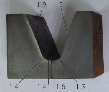 圖4中浸蝕較深的部分為硬化層,可見只有齒根高部分齒面被淬硬,齒頂高部分齒面和齒槽底部沒有硬化效果,同時齒槽兩側面硬化深度不均,分析認為這是由于齒頂部分齒面及齒槽底部與感應器側面及前部間隙過大,且兩側齒面與感應器間隙不一致所致。