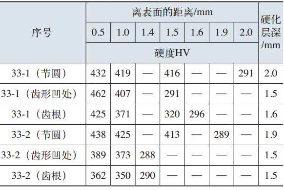 齒輪淬火后在熱風爐中380℃回火?;鼗鸷簖X面硬度45~46HRC。切片進行淬硬層深檢測,宏觀浸蝕形貌如圖10所示。用顯微硬度計檢測硬度分布情況,結果見表2。按GB/T 5617—2005判斷節圓有效硬化層深度DS=1.90mm,齒槽底部硬化效果良好,齒面硬度均勻,完全達到技術指標要求。