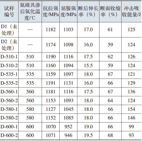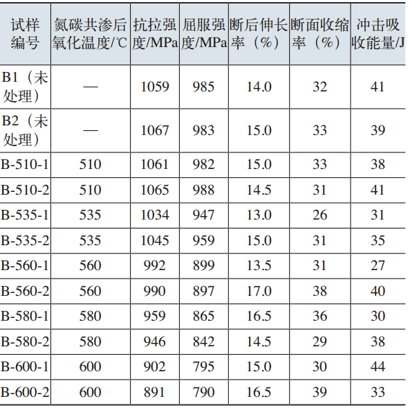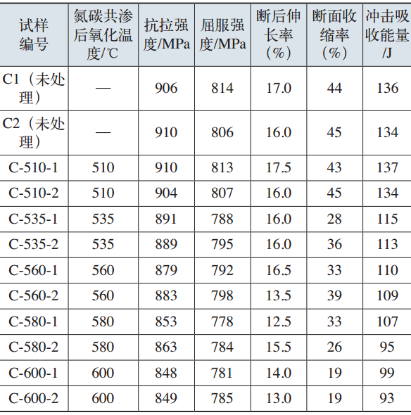 據(jù)國外文獻(xiàn)報(bào)道,離子氮碳共滲后氧化處理的前提條件是離子氮碳共滲處理后要有較厚的化合物層,這樣才能在后氧化處理過程中獲得致密的Fe3O4層,達(dá)到耐蝕目的。氮碳共滲后氧化常用溫度一般不低于560℃,對于高強(qiáng)度工件,采用氮碳共滲后氧化工藝存在降低材料原有強(qiáng)度的可能,因而有必要研究氮碳共滲后氧化對常用鋼力學(xué)性能的影響。