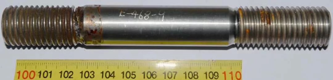 實(shí)際產(chǎn)品斷裂的雙頭螺栓,如圖1所示,其斷裂部位位于螺桿與帶螺紋的螺栓頭聯(lián)接處。