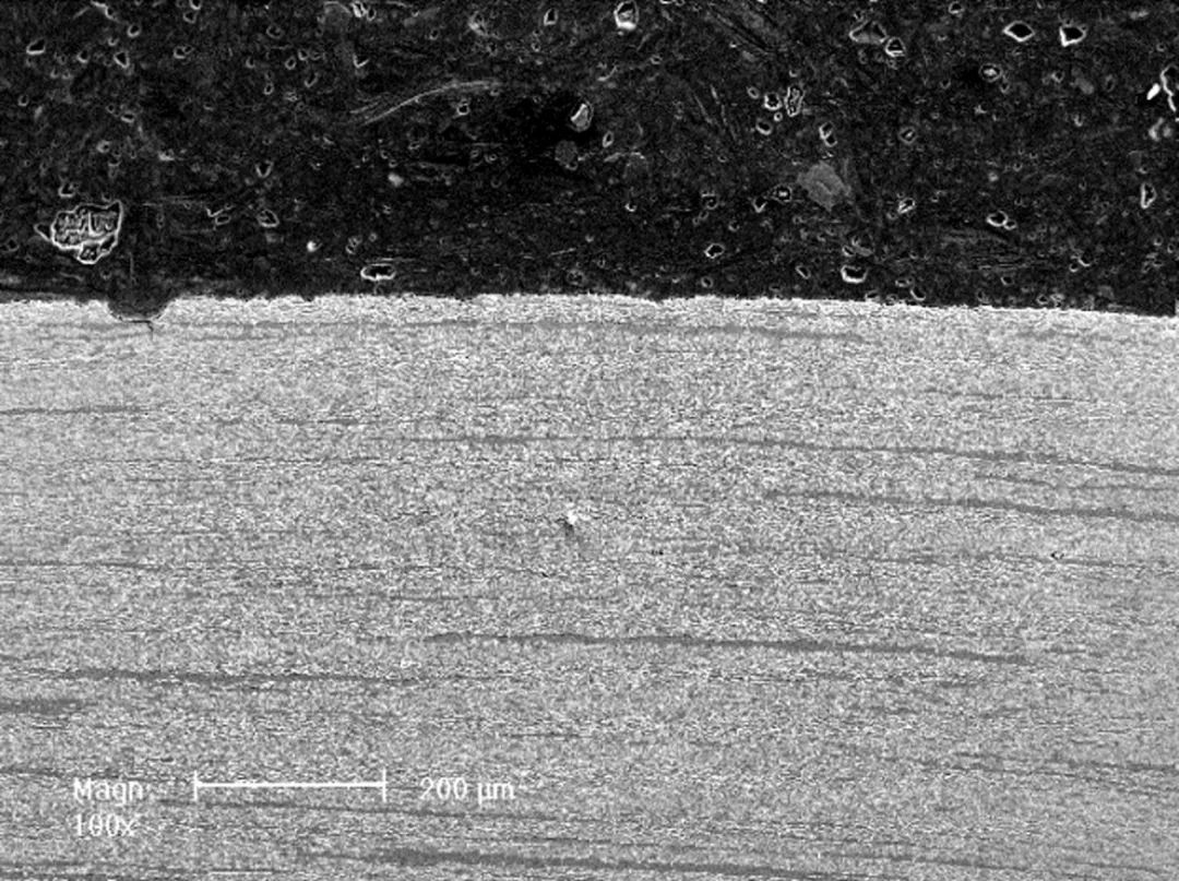 另取同批螺栓鍛件6件,對其進(jìn)行淬火:1020℃保溫后油冷至200℃以下出爐空冷至室溫,回火:600℃保溫后空冷至室溫的熱處理工藝,取其中3件試樣進(jìn)行力學(xué)性能檢測,其結(jié)果為:試樣7屈服強(qiáng)度806MPa、試樣8屈服強(qiáng)度811MPa和試樣9屈服強(qiáng)度794MPa。將剩余3件試樣進(jìn)行應(yīng)力腐蝕敏感性檢驗(yàn),其慢拉伸試驗(yàn)(SSRT)結(jié)果均為0,說明此時S43100不銹鋼的應(yīng)力腐蝕敏感性很小,然后對編號為8的試樣進(jìn)行斷口掃描檢驗(yàn),如圖5所示,無明顯腐蝕斷裂情況出現(xiàn)。
