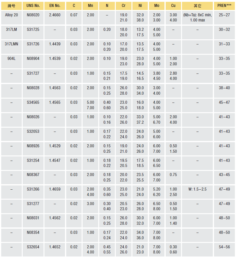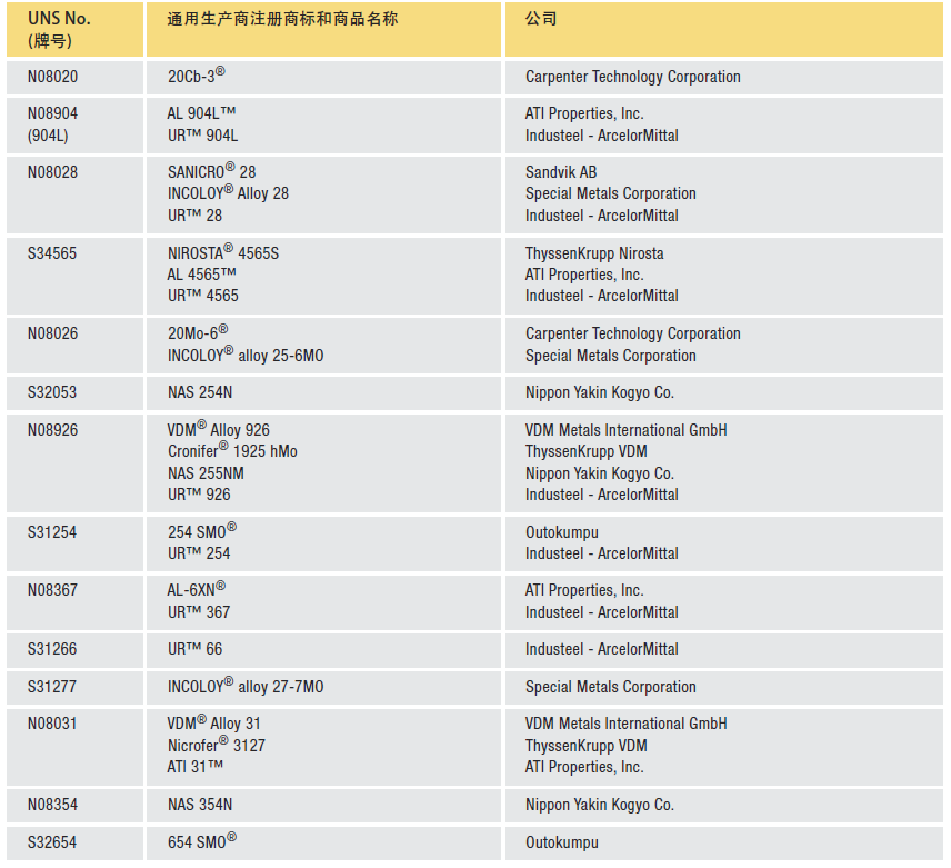 不銹鋼發(fā)明于二十世紀(jì)初,是英國和德國的一項創(chuàng)舉。在隨后的半個世紀(jì)中,開發(fā)了一系列的不銹鋼牌號, 它們成功地應(yīng)用于化工、能源、食品及其它行業(yè)。二十世紀(jì)七十年代初期,隨著鋼廠引入新的精煉和鑄造技術(shù),不銹鋼進入了現(xiàn)代發(fā)展階段。不銹鋼研發(fā)者和生產(chǎn)商利用這些技術(shù)對已有的 “標(biāo)準(zhǔn)牌號” 進行了改進,同時還開發(fā)了性能更優(yōu)的新牌號,其中包括新型高性能奧氏體不銹鋼。 新的煉鋼技術(shù)包括氬氧脫碳(AOD)和真空吹氧脫碳(VOD)工藝。采用這兩種工藝,可以有效地實現(xiàn)超低碳含量、高合金回收率、較好的成分控制特別是氮含量的精準(zhǔn)控制。電渣重熔法(ESR)可作為一種替代或補充工藝,更好地控制成分,使顯微組織更均勻,夾雜物更少。連鑄技術(shù)提高了生產(chǎn)效率,進一步降低了生產(chǎn)成本。 煉鋼技術(shù)的進步降低了標(biāo)準(zhǔn)低碳牌號如304L和316L的生產(chǎn)成本,改善了焊接部件的耐腐蝕性能。第一個采用新技術(shù)生產(chǎn)的高性能奧氏體不銹鋼牌號是904L(N08904),是由奧托昆普(Outokumpu)不銹鋼公司開發(fā)的。904L不銹鋼的碳含量非常低,是現(xiàn)有鑄造合金的可焊接鍛軋牌號,對強還原性酸環(huán)境有很高的耐腐蝕性能。1973年,ATI Allegheny Ludlum 公司推出了第一個完全耐海水腐蝕的奧氏體不銹鋼牌號AL-6X?(N08366),其Mo含量為6%,碳含量很低,可用于生產(chǎn)焊接薄板和管材。七十年代中期,氮的使用和控制得到了發(fā)展,進一步改進了6%Mo不銹鋼的性能,實現(xiàn)了厚斷面材料的焊接,并且能夠防止有害金屬間相(會降低耐點蝕性能)的形成。下表列出了含氮6%Mo不銹鋼牌號的UNS編號及相應(yīng)生產(chǎn)廠的商品名稱。 二十世紀(jì)九十年代,新興的能源和環(huán)保工業(yè)對高性價比、高性能合金材料的需求日益增長,對不銹鋼的耐腐蝕性能提出了更高的要求。開發(fā)出三個Mo含量約為7%、氮含量相對較高的不銹鋼牌號, 它們在腐蝕性含氯水中具有特別高的耐點蝕性能。這組高合金化的不銹鋼牌號為S32654、S31266和S31277,其性能與一些高耐蝕性的鎳基合金很接近,而成本卻低得多。下表給出了7%Mo不銹鋼牌號及生產(chǎn)廠的商品名稱。 加工制造中的換熱器管板?Sandvik 表1列出了一些常見標(biāo)準(zhǔn)300系和200系奧氏體不銹鋼的化學(xué)成分。高性能奧氏體不銹鋼的化學(xué)成分見表2。高性能奧氏體不銹鋼的鉻、鎳和鉬的含量遠(yuǎn)高于標(biāo)準(zhǔn)的18Cr-8Ni不銹鋼,很多牌號還添加了氮。 表1 常見標(biāo)準(zhǔn)鍛軋300系和200系奧氏體不銹鋼的化學(xué)成分*(重量%)和耐點蝕當(dāng)量(PREN)** 說明: * 選自ASTM關(guān)于中厚板、薄板和帶材的標(biāo)準(zhǔn)規(guī)范或企業(yè)的數(shù)據(jù)資料。 ** 一般指化學(xué)成分最大值,除非標(biāo)出范圍或最小值。EN的化學(xué)成分與ASTM的化學(xué)成分不完全一致。 *** 根據(jù)公式PREN = %Cr + 3.3(%Mo + 0.5%W)+ 16(%N)計算出的耐點蝕當(dāng)量及該牌號預(yù)期的名義化學(xué)成分。 表2 常見的高性能奧氏體不銹鋼的化學(xué)成分*(重量%)和耐點蝕當(dāng)量(PREN)** 說明: * 選自ASTM關(guān)于中厚板、薄板和帶材的標(biāo)準(zhǔn)規(guī)范或企業(yè)的數(shù)據(jù)資料。 ** 一般指化學(xué)成分最大值,除非標(biāo)出范圍或最小值。EN的化學(xué)成分與ASTM的化學(xué)成分不完全一致。 *** 根據(jù)公式PREN = %Cr + 3.3(%Mo + 0.5%W)+ 16(%N)計算出的耐點蝕當(dāng)量及該牌號預(yù)期的名義化學(xué)成分。