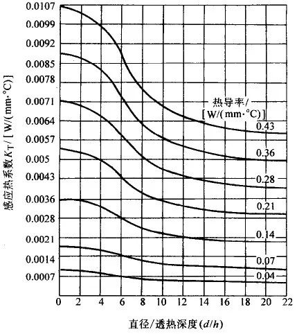透熱過程與金屬的熱導率(W/(mm·℃))及感應熱系數KT(W/(mm·℃))有關。圓棒的 d/h(直徑與透熱深度比)值與KT及熱導率的關系見圖3 。