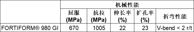 那么這個Fortiform 980 GI是什么樣的鋼呢?首先我們來看看它的力學性能,根據官方數據,Fortiform 980 GI實物力學性能如下表: