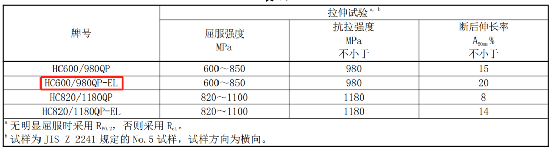 從上面性能看,其與現在國內寶武的第三代先進高強鋼HC600/980QP-EL有點相似,該牌號的標準性能要求如下表: