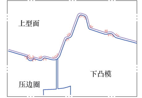 根據拉延模具成形的特點,與板料接觸的凸R位置和板料流動較大的面需要有高的耐磨性,即高硬度。如圖2所示,拉延模型面上的凸R一般都需要進行淬火處理。