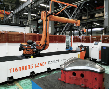 圖1為我公司激光3D雙工位淬火設備,主要由大功率激光器、六軸機器手、激光傳輸和聚焦系統、光學加工頭以及控制系統等組成。光源采用行業先進激光器,經光束耦合器耦合后采用柔性光纖傳輸,光束波長在970~1070nm之間,光束質量約為4.3mm·mrad,設備輸出功率在2000~6000W,輸出光斑直徑為0.2~4mm,光束寬度約為20mm。光學系統由準直、聚焦、光束整形等元件及監控系統組成;機床由六軸機器人和輔助機構(線性導軌)構成,軌道行程為4m,機械手運動直徑約8m。可采用離線編程系統、示教編程和專家編程等方法完成復雜形狀零件的三維軌跡規劃、編程以及運動程序的生成。