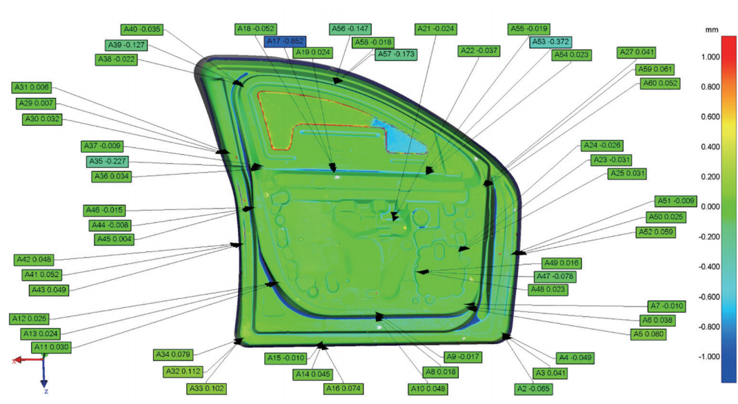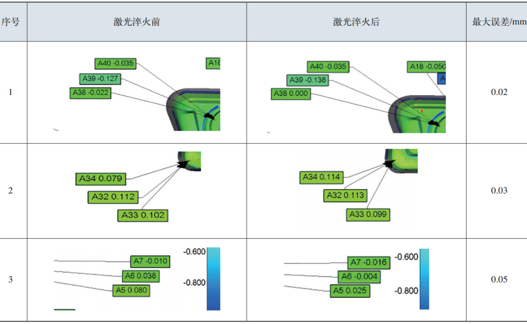 由于淬火區域大,常規的火焰淬火或感應淬火都會使工件產生較大的熱變形,導致模具精度無法保證,進而需要增加其他的工藝手段來保證,這樣勢必造成模具的加工周期長,且易出現硬度不穩定的情況。因此,我們改為采用激光淬火方式,這樣工件變形極小,甚至無變形,不需增加其他工藝手段即可達到質量要求。如圖3和表1所示,我們采用激光淬火方式對某車型的門內板進行淬火處理,通過藍光掃描檢測淬火前后的型面變化情況,得知激光淬火后的模具型面能滿足精度要求。