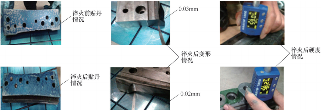 經過研究和實踐,我們發現激光淬火可以有效地控制鑲件變形和硬度不合格的問題。圖5所示是切邊鑲件和整形鑲件的激光淬火硬度情況和變形情況,從圖中可看出,鑲件采用激光淬火后硬度穩定、變形很小,實現了精加工后淬火的制造工藝,有效提升了加工效率,節約了加工成本。