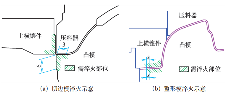 汽車模具上的鑲件表面淬火,主要指切邊模的切邊鑲件刃口淬火和整形模的整形鑲件整形部位淬火,如圖4所示。