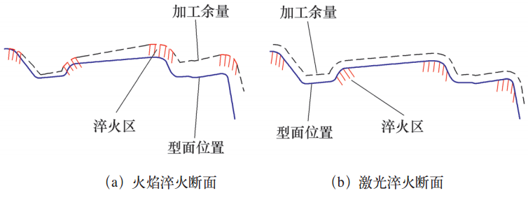 質量的影響  相對于傳統淬火方式,采用激光淬火方式的模具型面變形很小、硬度均勻,因此工藝上采取型面精加工到位后再進行淬火。圖6所示是采用火焰淬火和激光淬火方式的模具型面斷面。