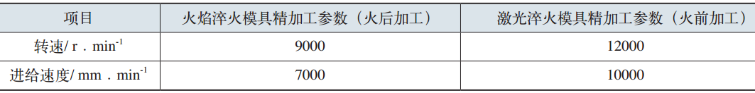 采用激光淬火的模具,淬火前型面精加工到位,這樣既避免了去變形加工工序,又提升了精加工的效率。以某機床為例,表2是采用火焰淬火方式和激光淬火方式模具精加工的參數情況,采用激光淬火方式的模具加工效率比采用火焰淬火方式提升了30%以上。