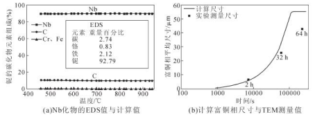 作者繼續計算了析出相的元素組成與溫度之間的關系和富Cu相尺寸與時效時間之間的關系,然后通過相應的試驗驗證了計算結果,如下圖,發現計算結果與試驗結果有很好的符合性。