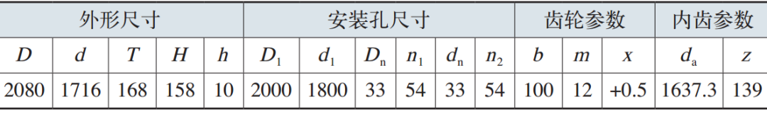 本文進行失效分析的對象包括軸承內圈(2塊,其中一塊含有裂紋)、軸承外圈(2塊)、滾子(10個),分析變槳軸承樣塊的外觀尺寸,可確定該軸承為內齒雙排同徑四點接觸球軸承。測得外圈高度H=158mm,外圈安裝孔直徑Dn=33mm,內圈安裝孔直徑dn=33mm,鋼球直徑Dw=40mm。參照GB/T 29717—2013《滾動軸承風力發電機組偏航、變槳軸承》中表5,可判斷該變槳軸承的型號應為FD-033.40.1900.03K。其材料為42CrMo,預備熱處理方式為調質處理。FD-033.40.1900.03K型軸承的外形尺寸如表1所示。