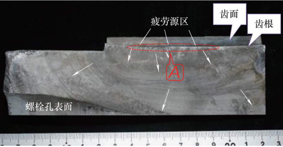 宏觀可觀察到軸承內圈螺栓孔附近有一條長約70mm的裂紋,從齒根向滾道方向擴展,未完全穿透整個軸承截面,如圖1所示。用線切割取出裂紋(斷口),經清洗后拍照,如圖2所示。從斷口宏觀形貌可以觀察到典型的貝紋線特征,表明變槳軸承為疲勞開裂。從貝紋線走向,可判斷疲勞源位于變槳軸承內圈輪齒的齒根處。