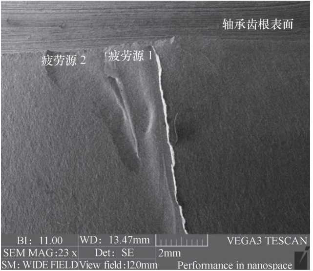 由于軸承滾道淬硬層深度不夠,在軸承運行過程中首先在滾道表面發生接觸疲勞,導致在滾道表面產生大量的點蝕坑,引起軸承精度降低,振動加??;隨后在軸承內圈輪齒的齒根應力集中處產生疲勞裂紋源,由于軸承套圈材料硬度不足,低溫韌性差,導致疲勞裂紋快速擴展而失效。