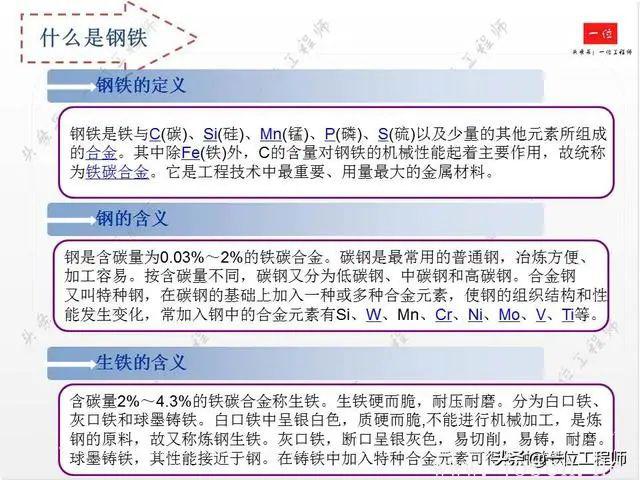 鋼鐵是鐵與C(碳)、Si(硅)、Mn(錳)、P(磷)、S(硫)以及少量的其他元素所組成的合金。其中除Fe(鐵)外,C的含量對(duì)鋼鐵的機(jī)械性能起著主要作用,故統(tǒng)稱為鐵碳合金。它是工程技術(shù)中最重要、用量最大的金屬材料。