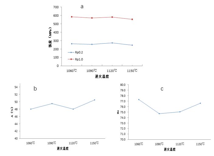 對(duì)熱軋后鋼板在1060℃、1090℃、1120℃、1150℃等不同溫度下保溫30min進(jìn)行固溶處理,固溶處理后的性能試驗(yàn)結(jié)果如圖5所示。從圖中看出,隨著固溶處理溫度的變化,904L性能發(fā)生一定變化,屈服強(qiáng)度和抗拉強(qiáng)度呈現(xiàn)一定的下降,但變化不是很明顯,延伸率呈現(xiàn)一定的上升,硬度呈現(xiàn)先下降后上升趨勢(shì),但均滿足GB/T4237-2012標(biāo)準(zhǔn)之相關(guān)規(guī)定,綜合試驗(yàn)性能來(lái)看,在1150℃退火后表現(xiàn)出綜合的力學(xué)性能。