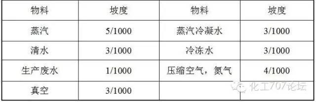 管道敷設應有坡度,坡度方向一般均沿著物料流動方向,但也有與物料流動方向相反的。坡度一般為1/100~5/1000。輸送黏度大的物料管,坡度要求大些,可至1/100。含固體結晶的物料管道坡度可至5/100左右。埋地管道及敷設在地溝中的管道,在停止生產時,其積存物料不考慮放盡,可不考慮敷設坡度。