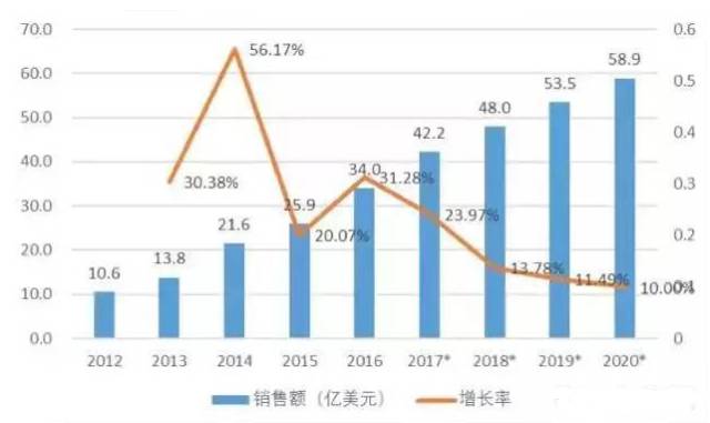 當前,我國生產制造智能化改造升級的需求日益凸顯,工業機器人的市場需求依然旺盛.預計2017年我國工業機器人銷量將首次超過11萬臺,市場規模達到42.2億美元。到2020年,國內市場規模進一步擴大到58.9億美元。