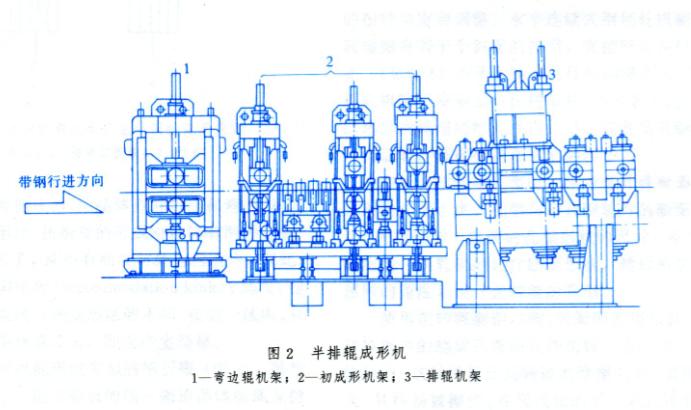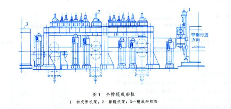 排輥成形機(jī) 排輥成形機(jī)的種類很多,但大體上可分成兩類:全排輥成形機(jī)和半排輥成形機(jī)。全排輥成形機(jī)是在第一架初成形水平機(jī)架至精成形機(jī)架問全部由可調(diào)排輥組成的成形機(jī),如圖1所示。半排輥成形機(jī)是在第一架初成形水平機(jī)架與精成形機(jī)架間有水平機(jī)帶架和若干可調(diào)排輥組的成形機(jī),如圖2所示.