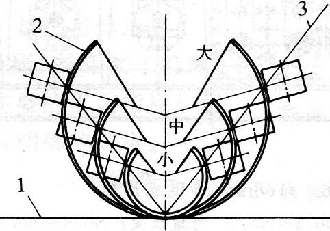 80年代初期全排輥成形發(fā)展到了鼎盛時(shí)期,它以其無可比擬的優(yōu)點(diǎn)為壁厚與管徑比(t/D)小的薄壁大口徑鋼管生產(chǎn)提供了可靠的成形技術(shù)。但它只適用于薄壁管和中等壁厚管的生產(chǎn),也就是t/D在≤1%(下限)到<5%(上限)范圍內(nèi)。80年代后期焊管向厚壁、特殊材質(zhì)和高強(qiáng)度方向發(fā)展,而全排輥成形機(jī)最大的缺陷是生產(chǎn)厚壁管時(shí)剛度不足。為了充分利用排輥成形的優(yōu)點(diǎn),1984年日本新日鐵公司設(shè)計(jì)了一套半排輥φ406m(16in)成形機(jī),生產(chǎn)管徑114.3~406mm、壁厚2.1~19mm、t/D1.2%~12%的厚壁管,采用w孔型系統(tǒng),如圖4所示.