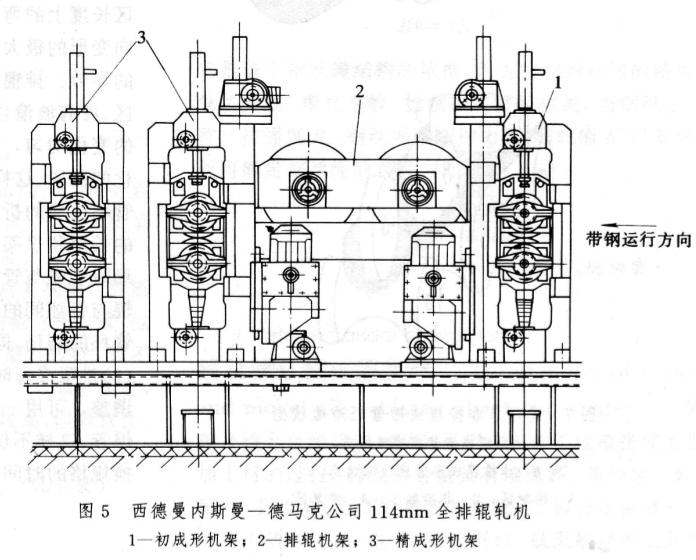 1984年西德曼內(nèi)斯曼一德馬克(Mannesmann Demag)公司制造了一種直徑33~11.4mm、壁厚2~7mm、壁厚與管徑之比t/D一12.5%~1.25%的全排輥軋機(jī)(圖圖5),采用U形孔型系統(tǒng)..