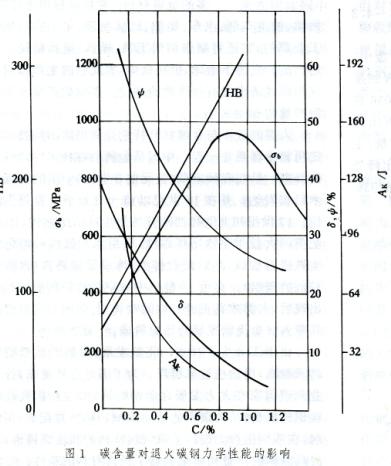 力學性能 碳含量對退火碳鋼力學性能的影響如圖1所示。由圖1可知,隨碳含量增加,碳鋼的伸長率、斷面收縮率和沖擊韌性下降,而硬度上升;但是抗拉強度先是上升,然后下降。碳鋼力學性能與碳含量的關系反映了碳鋼顯微組織與碳含量之間的關系。鐵素體是軟而塑性好的相,滲碳體是硬而脆的相。