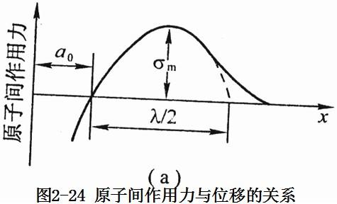 設(shè)想完整的晶體材料被解理面分開成兩半晶體,其解理面的晶面間距為a0, 沿拉力方向發(fā)生相對位移x, 當(dāng)位移很大時,位移和作用力的關(guān)系并不是線性關(guān)系。而原子間的相互作用力最初是隨x的增大而增大,但達(dá)到一峰值σm后就逐漸下降,見圖2-24。
