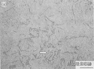 附圖為42CrMo鋼分別在第一組、第五組和第九組熱處理工藝參數下的顯微組織圖。圖中的明亮基體均為馬氏體組織,不規則顆?;驐l狀組織為貝氏體和鐵素體,其中黑色的基體為板條馬氏體組織,較為明亮的為貝氏體組織,亮點是未溶碳化物或貝氏體組織端部與觀察面相截的結果,而鐵素體上的亮點(如右箭頭所指)是轉變過程中析出的碳化物。