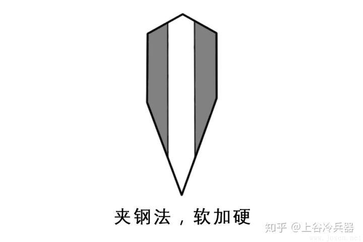 夾鋼與包鋼相反,是用較硬的鋼材做里,兩面夾軟鋼。兩邊的軟鋼有足夠的彈性,包裹住里面的高碳鋼,使得中間的鋼材即使彎折也不會斷裂。夾鋼可以制造出雙刃劍,打磨也不需要很小心,主體結構的強度還更高。